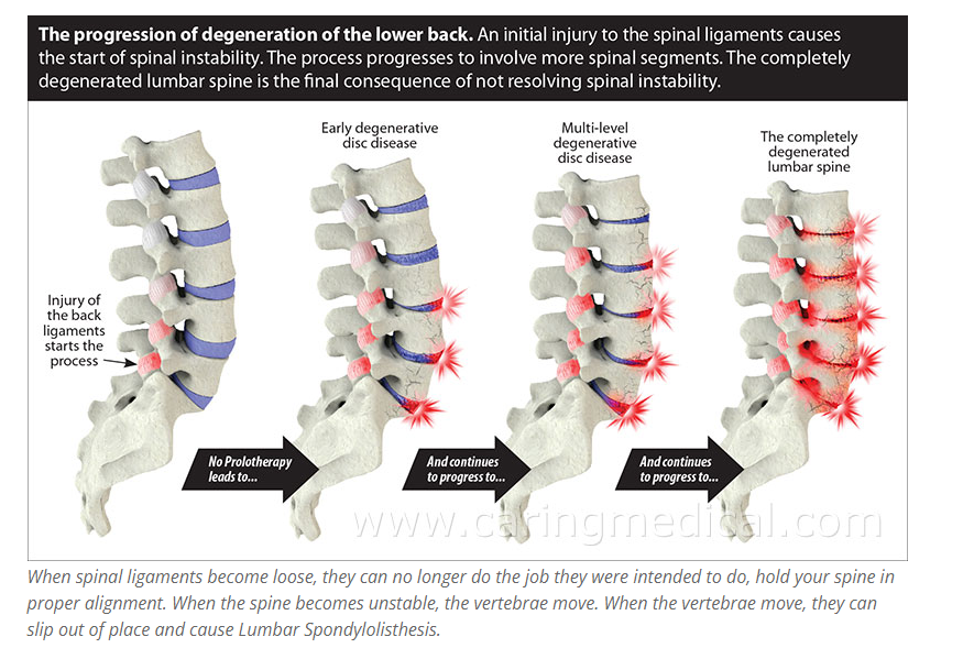 在脊椎不穩定造成滑脫的患者,除了透過核心運動去強化肌肉外,這些鬆動的韌帶與是可以透過增生治療強化這些韌帶的穩定性,避免滑脫更加惡化。更甚者,在滑脫的患者,平常這些韌帶的傳導痛區域,就是平常腰痠背痛的位置。