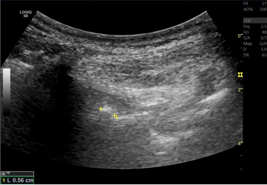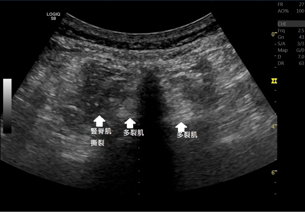 在超音波底下除了可以看到小面關節骨刺、韌帶撕裂、韌帶鈣化等等著病徵,甚至在肌肉層也會有一些變化。例如多裂肌的纖維化(Fatty fibrotic change)、豎脊肌的撕裂,這些都跟脊椎滑脫有關。