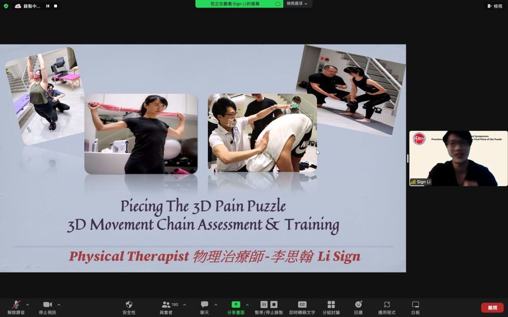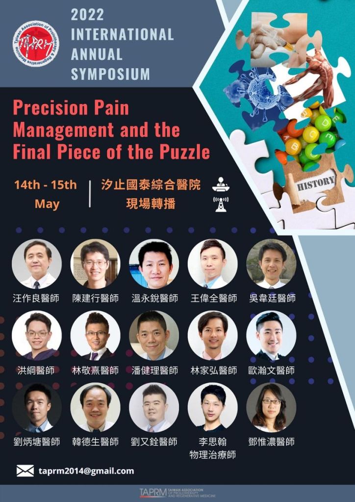 很榮幸接受台灣增生醫學會(TAPRM)會長王偉全醫師邀請參加這次年會演講。內容為增生治療結合肌力測試的臨床證據與使用心得和限制。因應疫情,此次年會改為線上召開,但眾多台灣與國外的醫師熱情不減,最多人時線上同時有海內外超過200名醫師共同參與。感謝辛苦的會長、講師群與工作人員共同舉辦。 此次內容包含增生治療的過去、現在與未來,傳統增生注射與新一代生物再生注射,甚至囊括了修復必備的營養素、毒素與身心健康的部分。同時也有汪醫師帶來的全人評估,李思翰物理治療師的3D評估,疼痛科溫主任帶來的神經刺激器,其中最令人難忘的是香港的林敬熹醫師帶來整整兩個小時的精華演講。很感謝會長能夠邀請這麼多講者,帶給大家增生治療從Basic到最遠端的應用都含括進去。這次的主題: 增生治療的最後一塊拼圖,雖然大家提出的拼圖都不一樣,但確實把這些一點一滴地加進去,更能夠完成把增生治療精準化與全人化的目標。