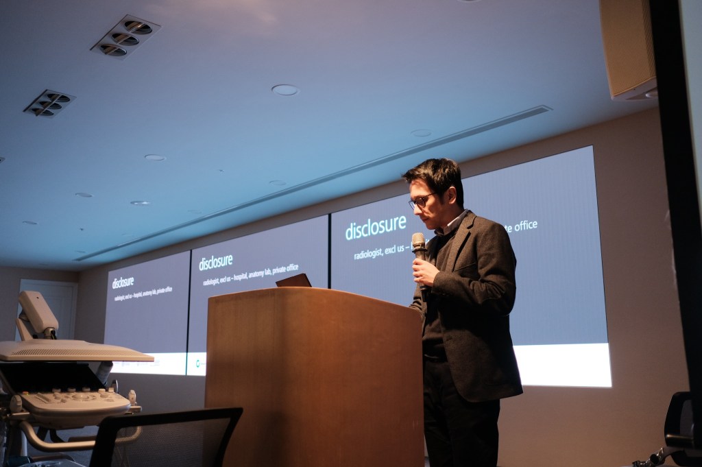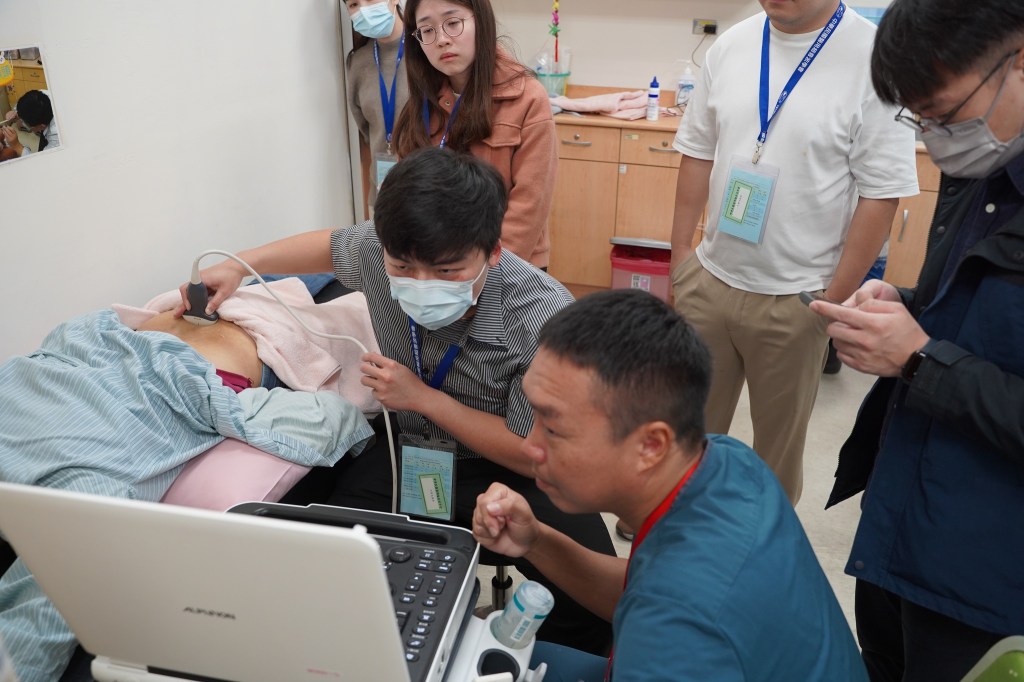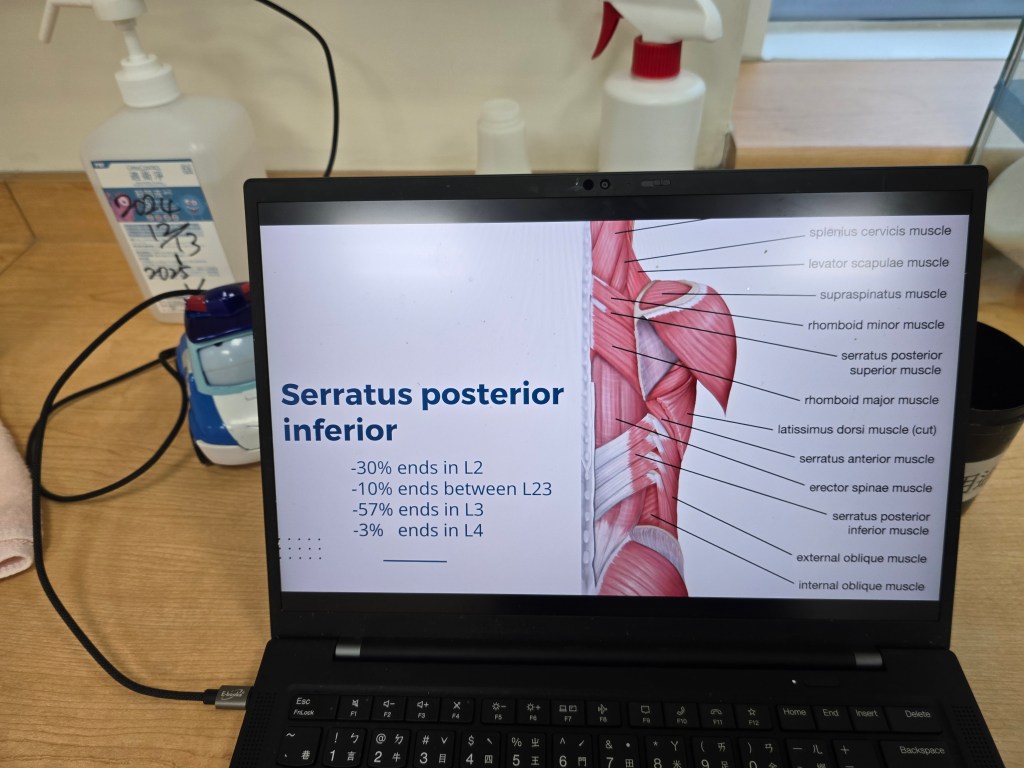此次為第二次協助學員使用超音波進行腰椎掃描。從臨床診斷的角度來看,超音波在腰椎的應用相對受限,主要因為腰椎問題多集中於椎間盤或椎體的問題,而超音波僅能呈現椎間盤的陰影輪廓,對診斷的價值有限。然而,藉由辨識骨骼的相對位置,我們能有效協助學員將針準確定位於核磁共振顯示異常的部位,進一步提升臨床操作的精準性。
