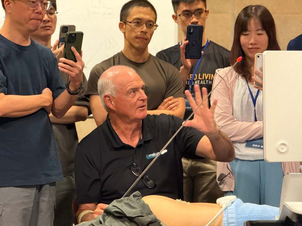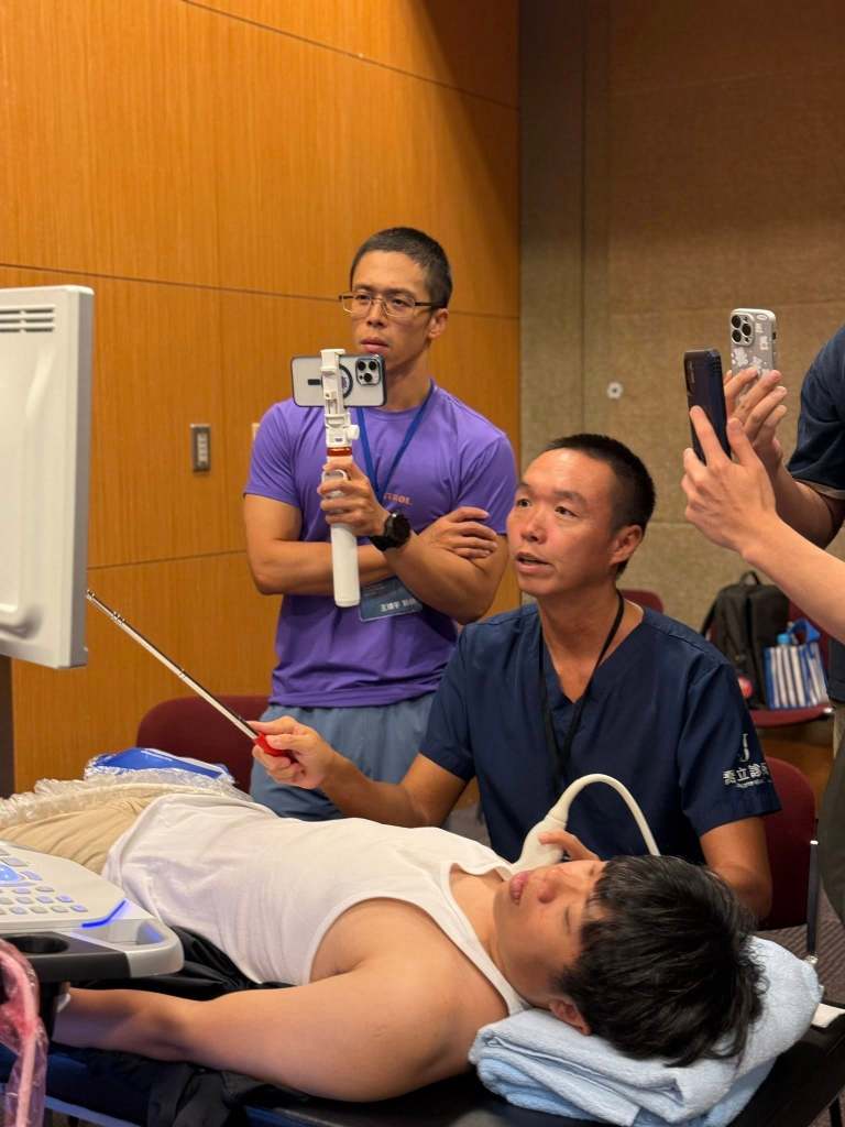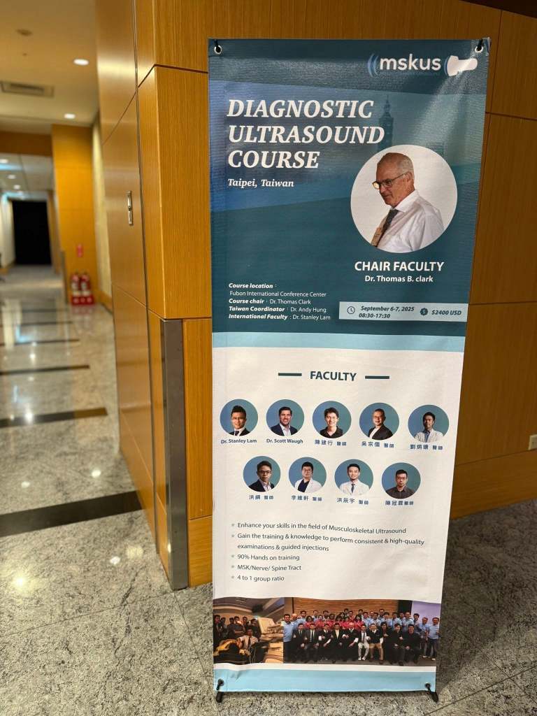 MSKUS 超音波課程於1998年,由當代超音波大師Dr.Thomas Clark 所創立;除了在美國是指標性的實作課程 ,也在全球各地舉辦過各式工作坊。這次承蒙台灣增生療法協會理事與生昇診所洪綱院長邀請,擔任此次工作坊的小組講師。跟其他課程不同,MSKUS捨去了大堂課的時間,主要把時間都給學員掃描,小組講師從旁協助與更正,是一個更重視實作的工作坊。這次同樣分為三大領域:肌骨診斷MSK track, 神經掃描Nerve track, 和脊椎Spine track ;此次有幸與多位擁有豐富的超音波經驗和臨床實戰能力的小組講師共事,同時也從擁有多年教學經驗的Tomas大師身上學習到許多以前不曾注意的細節。以前要上這種課程需要飛往美國,光是食宿跟機票就是一大筆開銷。感謝增生療法協會與生昇 診所院長洪綱院長,讓台灣的學員能夠在台灣就接觸到這麼棒的課程。這次意外也收穫了由Tomas大師本神親簽的教學棒,希望能把教學的精神傳承下去。
